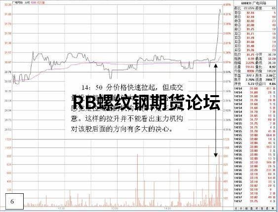 第一,直升式拉升。前几天和当天的走势都很平淡,尾盘最后几分钟突然拉升,中间不出现震荡回调,基本是一条直线上行,成交量快速放大,不给任何人追进的机会。如果全天的成交量因为尾盘的拉升而明显放大,显示主力资金无法出逃,必须采取拉高再想办法出货的方式了。后市主力还是会以出货为主,不然走势不太看好。