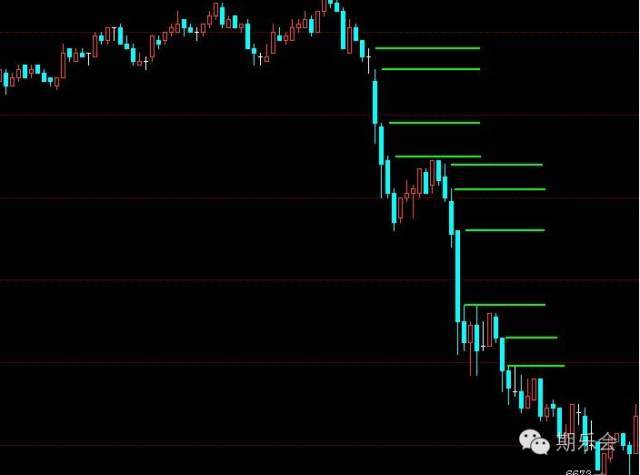 当然,均线止盈的方式有它的弊端,比如价格跳空高开低开的时候,我们是没有办法运用均线的那我们利用第二种办法,K线的高低点止盈。比如现在做空,价格下跌的速度比较快,那你就利用上一根K线的高点作为止盈点,当价格下跌速度放缓,就利用再上1根K线的高点作为止盈,这样不断的转换止盈的方式,针对价格波动的节奏,灵活变动(采用这样的方式主要是为了防止行情突然反方向大幅运行,另外,也是为了给行情下跌时的横盘调整,预留一个空间,这个大家在应用的时候一定要注意,不能设的过于紧贴价格,从而错失更多的盈利。也不可设的过于宽松,防止利润回吐,这个度需要大家多练习,灵活掌握。)我们来看一个实例: