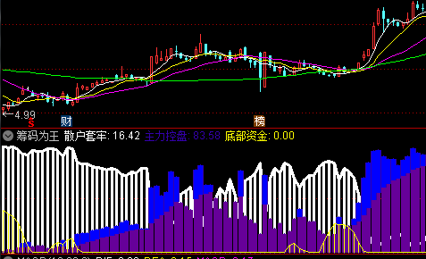 白色柱为散户套牢,蓝色柱为主力控盘,黄色为底部资金。