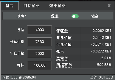 如果价格继续下行,到达7000,此时多单4000张均价7350左右,空单500张均价8000.