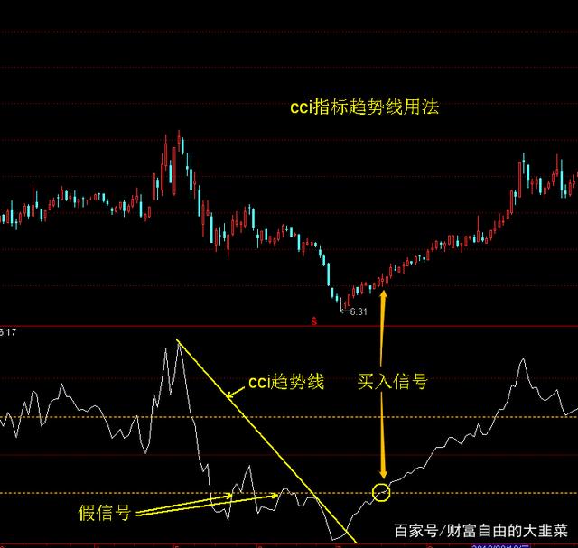 cci指标也不是常常会发生底背离,所以当没有发生背离现象的时候,可以采用cci指标突破趋势线的方法进行买入,如图.第一步正确画出cci指标的下跌趋势线,当cci指标突破趋势线后开始引起注意了,而当cci指标突破-100的时候就产生了买入信号。这样的好处就是避免了平常用法的很多假信号。同样的方法也可以得到跌破趋势线的卖出信号。