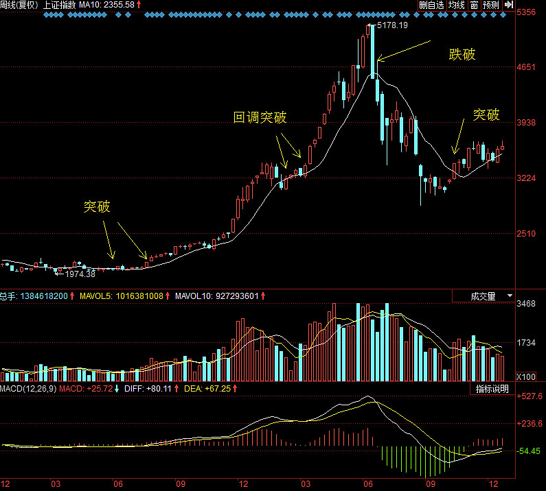 另外,一般在此时咱们还会加上其它指标对股指进行辅助判断,如标志性K线,该附近区域已经在2015年5月29日该周出现了长上影线和2015年6月19日该周出现了大阴线,故加上跌破【10周线】,这是明显的见顶信息,此时退出股指为唯一的选择。