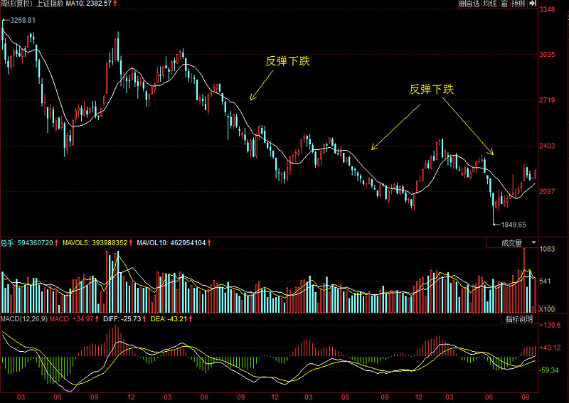 随后,股指迎来连绵不断的下跌行情,下跌途中有4次反弹要突破10周线,其中2次突破10周线但10周线没有走多,另外2次仅仅接近10周线但没有突破10周线。故这些仅仅是下跌途中的反弹行情。