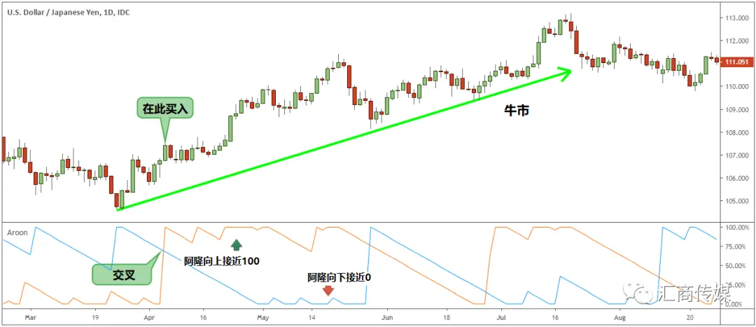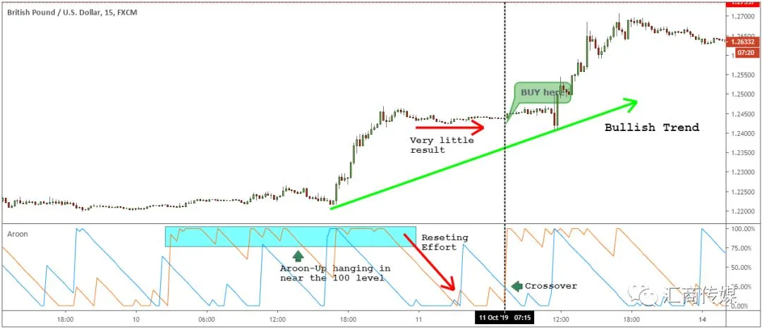 阿隆指标的买卖信号很简单。主要的阿隆买入信号发生在阿隆向上线向上移动的时候。当阿隆向上线上升到100点时,图表也会显示价格正朝着看涨的方向发展。这背后的原因是,我们的图表正在形成Higher High。我们得到了更多的看涨蜡烛,这就是阿隆线所揭示的信号。