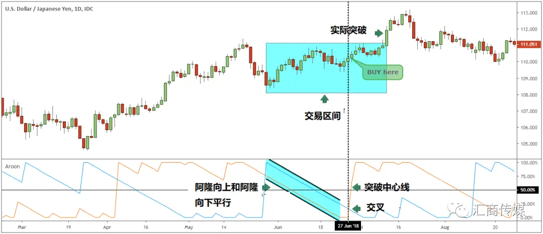 对于此时的合并,我们有两种交易选择。等待突破的发生,将交易带向突破的方向。或者,等待阿隆交叉之后的中心线交叉,为交易的方向增加更多的汇流。更常见的情况是,这些信号发生在真正的突破之前。见下图: