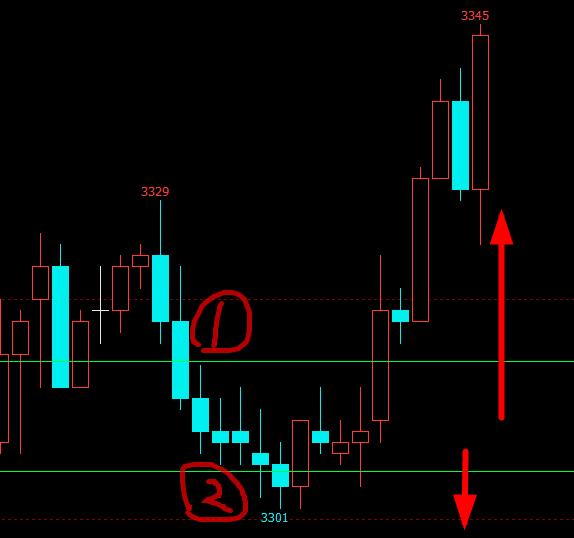 为了过滤危险交易最初的2根K线,我们放弃。虽然放弃,但是可以用另外的用途,我们可以把它用做我们每天的交易量化指标。分别在这2根15分钟k线的最低点和最高点画上横线。如下图所示: