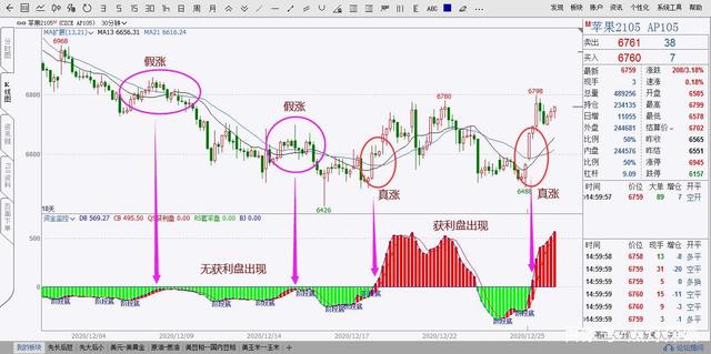 上图2为苹果期货当前30分钟图形,图中粉色圈的位置,价格虽有突破均线系统,但下方全部表现为套利盘,此时突破均线视为虚涨不宜进行买入;图中红色圈的位置,价格突破均线组的同时,下方出现明显获利盘增加,表示市场中主力资金积极买入,此时价格上涨的概率就很大了,视为真涨。
