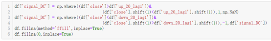 将收盘价和通道上下轨和中心线作图。需要注意的是,实际上策略信号是收盘价和上一个交易日的唐奇安通道指标进行比较(以避免未来函数),其结果也呈现在第二张子图中。可以发现,价格向下击穿下支撑线,指标发出做空信号。
