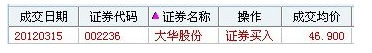 即:在5日线上介入,这个位置往往是最佳买入点,以下图操作大华股份的例子,在远离5日均线上方任何一个价位买入,都很难赚钱,但如果是在5周线附近买入,就可以轻松赚5个点,实盘交割单一并附后,供大家研究分析。