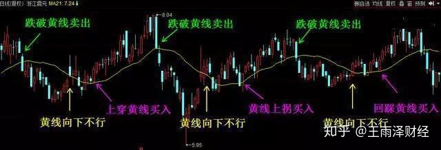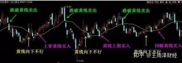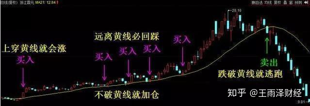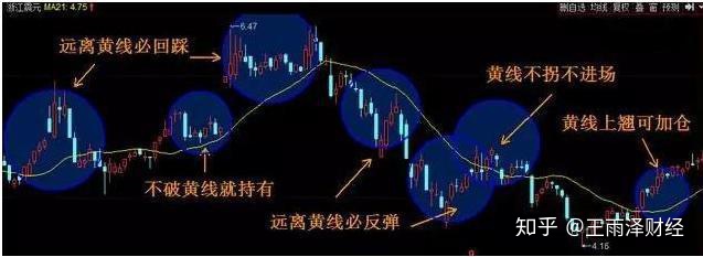 1.只要收盘价在21天均线之下就要跑;2.只有满足21天均线上拐这个条件后,看到K线上穿21天均线才能追涨;3.在21天均线向上过程中,每一次回踩而不破都是加仓上车的机会;这里特别还要提一下"回踩"二字是什么意思,请继续看下图……