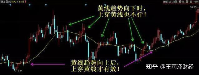 如上图,如果只看K线就知道这是个正常的波动市,有人肯定会说:"我就喜欢这个,最适合做高抛低吸啦!"您先别急,您回忆一下您每次高抛低吸都刚好抛在山峰上、抄在山谷里?其实是经常追在山腰上、又等跌回来才割吧?问题就是,咱看到后面的走势了才知道前面是那样儿的,对吧!您本来以为一反弹就拉起第二波能创新高的是不是?……那么,21天均线就告诉您,到底是冲高回落还是拉出主升浪!……再次看上图,只有当黄线上翘的时候,K线上穿黄线才是主升浪,如果黄线还在下移,就别那么自信的做波段,咱不知道它站上均线后到底能涨几天就下杀。