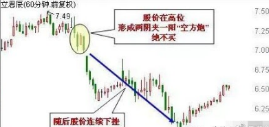 所谓的空方炮就是指两阴夹一阳的K线形态,它由两根较长的阴线和一根较短的阳线组成,三根K线呈下跌趋势,阳线夹在阴线之中,阴线的顶部尽量低,阳线的实体尽量短。当股价在高位区域出现空方炮时,表示空方取得支配地位,多方虽有反抗,但力量微弱,明显不敌空方,后市看跌。
