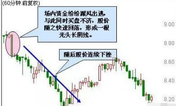 股价连续上涨后,运行至高位,突然在某个60分钟内大抛单连续涌出,导致场内资金纷纷跟风出逃,与此同时买盘不济,股价随之快速回落,形成一根光头的长阴线。此K线形成后,通常表示主力出逃坚决,短期内不再会给高位套牢盘出逃机会,个股后期走势看淡。