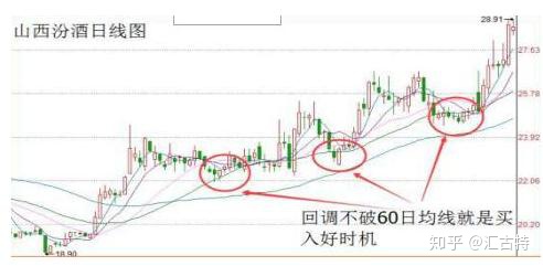 以山西汾酒(600809)为例,从18.90这一低点开始,MA均线开始向上发散并逐渐呈现多头排列,这个时候逢低进场将会有较大的获利空间。价格强势拉升一波之后,开始回调蓄力,每次回调都没有破掉30日均线就出现转头上走信号,这时又是买入好时机。