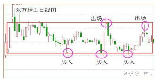 以东方精工(002611)为例,股价进入震荡箱体后,震荡箱体的下边缘会对价格产生强支撑,临近震荡箱体的下边缘买入一般来说比较安全,如图画出的买入点。价格上行到震荡箱体的上边缘附近,做止盈离场,如图画出的出场点。 按照此方法操作,震荡行情中的利润都可以收入口袋。