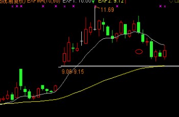 EXPMA在刚刚形成金叉(即EXPMA10日均线往上穿EXPMA60日均线)不久,相对高位收出一根螺旋桨或者大针头K线。短期回落至EXPMA10均线位置,买点出现。