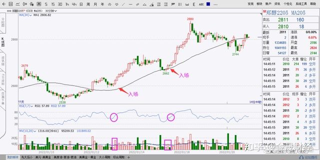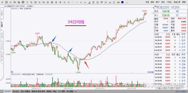 上图2为郑醇期货当前短周期30分钟行情走势:价格跌穿34日均线之后形成突破,此时回踩的过程,出现止跌形态,成交量再次放量,往往是行情二次启动的信号,三个条件 同时满足,之后价格便形成快速上涨。