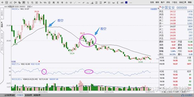 上图3为个股中国宝安当前走势图形:从股价从顶部一路下跌,跌破34日均线之后一路狂跌,34日均线形成空头排列,RSI指标下穿50轴;中途股价虽有反弹,但回踩均未止跌,再次形成跌破,之后再行形成持续性下跌。