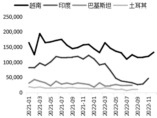 从棉花主要消费国的情况来看,自年初以来,纱线和纺织品市场的需求略有改善,当前处于环比走势向好,但同比仍旧偏差的状态。其中越南2022年12月纱线出口量环比增加11.4%,印度2022年11月棉纱出口量环比增加65.5%,孟加拉近期的纺织订单也有所小幅增加。全球仍处于供需同步下调格局,但消费走弱更为突出,使期末库存步入持续累积的趋势当中。