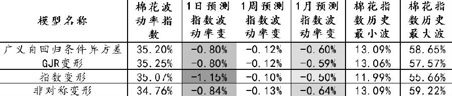 目前棉花商品场内期权平值隐含波动率为70—80历史分位,根据上述GARCH(1,1)模型预测的变动值数据判断棉花期货市场波动率将呈现振荡走弱的趋势。