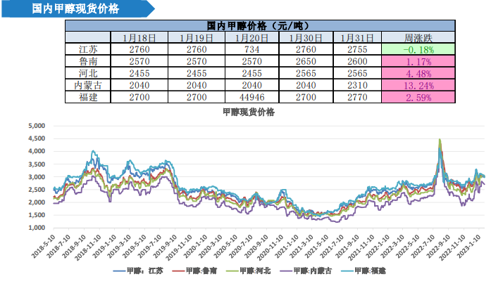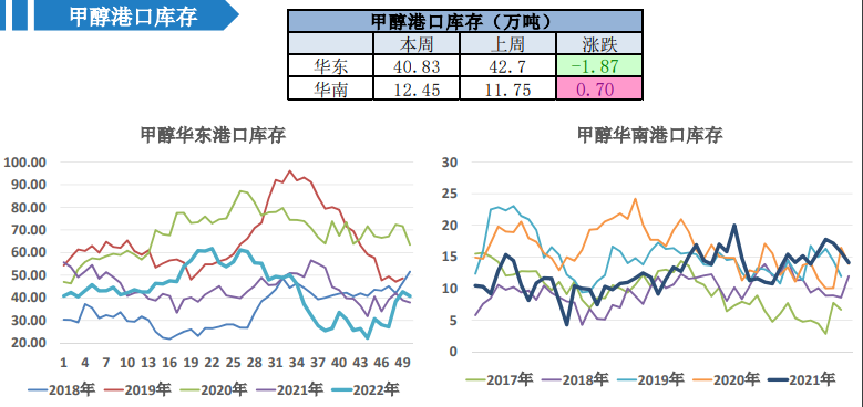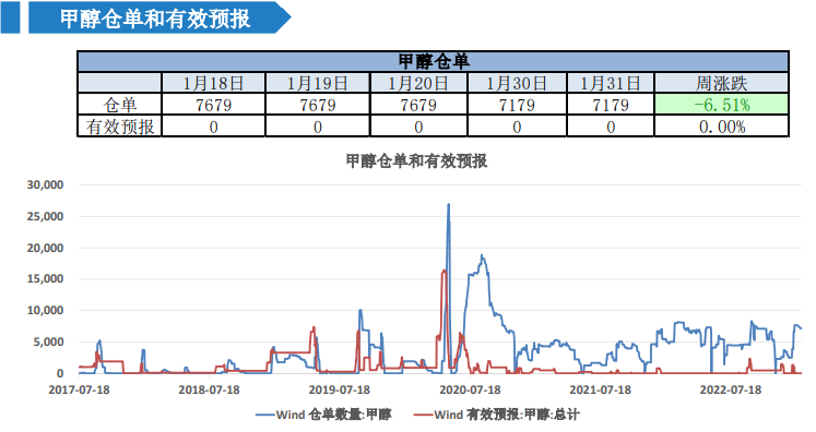 3、库存:截至2023年1月19日,华东、华南港口甲醇社会库存总量为53.28万吨,较上周同期降1.17万吨;沿海地区(江苏、浙江和华南地区)甲醇整体可流通货源在29.81万吨,较上周同期降0.71万吨;中性。