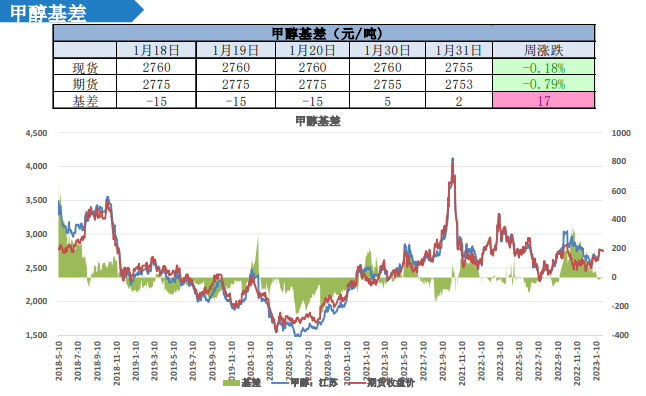 2、基差:1月31日,江苏甲醇现货价为2755元/吨,基差2,现货平水期货;中性。