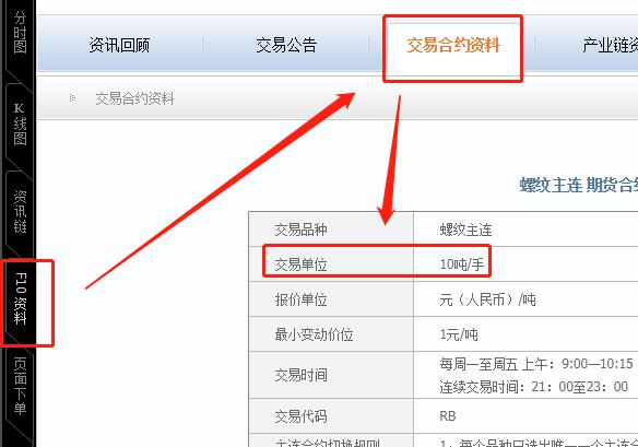 可以看到上图,在左边有个“F10资料”,在上面有个交易合约资料,螺纹钢最小交易单位也非常详细提现出来了!