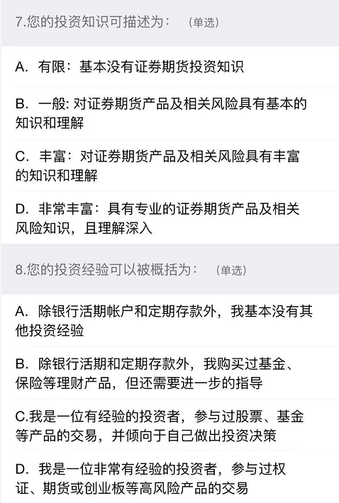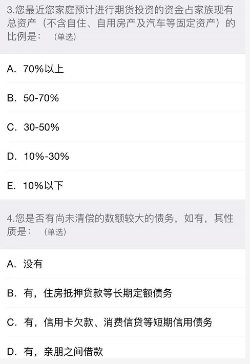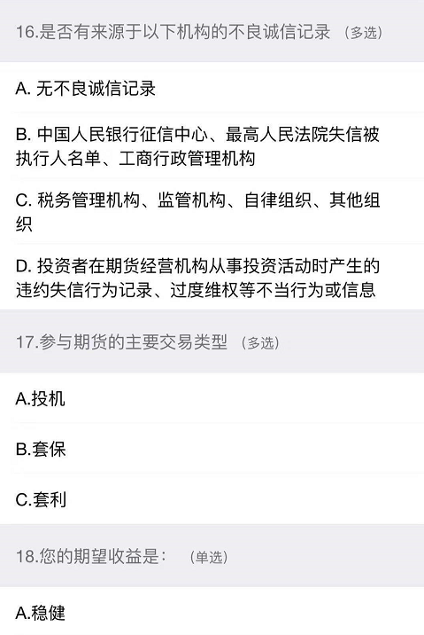 期货云开户风险承受能力问卷C4评级越来越重要了,相信许多粉丝还不太了解,目前由于国内原油期货开通要求相对简单了,但是依然有一个潜在被很多交易者忽略的门槛,就是这个C4评级。因此当你在开户过程中,如果能直接达到C4,今后可以省下不小麻烦。因此RB螺纹钢期货交易网为了方便大家开户,特意结合一位粉丝开户案列,结合8涨高清大图,一步步带着大家答题。