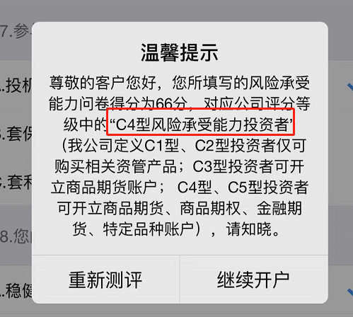 以上就是有关“期货云开户风险承受能力问卷C4怎么弄?8张高清图照着做就行”的主要内容,其他提问按照正常实际情况填写基本不会有什么大问题,最后就会出现这样一个评级提示