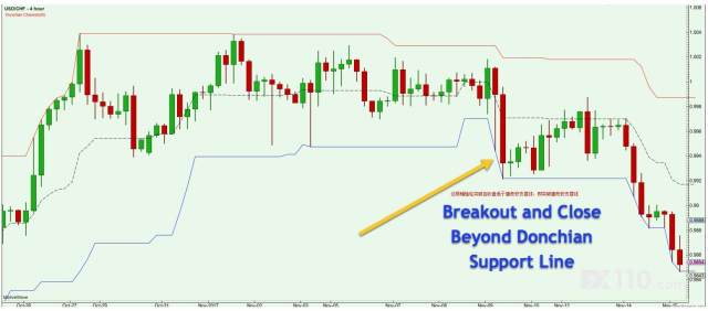 注意,图表上的价格在一个范围内交易,此处有一根突破柱收盘价低于唐奇安通道下线。这将被视为唐奇安支撑线突破。