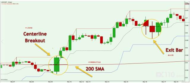 另一方面,假设200周期移动平均线与唐奇安中心线在20周期移动平均线的中心线以下交叉并收盘时,则开始做空交易。这是一种简单而强大的入场技术。