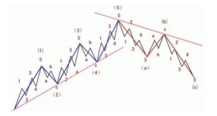 波浪理论认为市场走势不断重复一种模式,每一周期由5个上升浪和3个下跌浪组成。即无论市场运行时间长短以及涨跌幅度大小如何变化,市场基本形态永远不会改变。基本浪型结构如下: