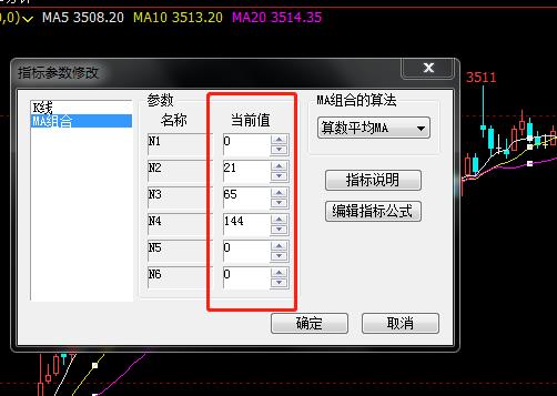 在当前值中设置自己想要的参数,比如在RB的【适用新手的5分钟144均线交易系统,辨方向真简单有效!】这篇文章中介绍的21、65、144日均线就可以填入下图所示的均线参数设置。