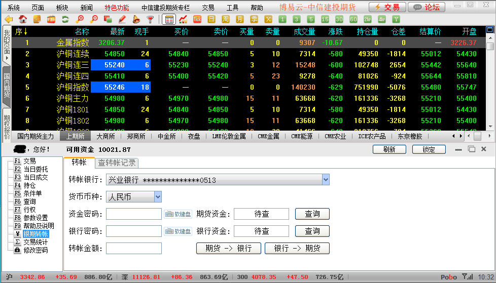 3、输入资金密码和银行卡密码(银行卡取款密码)后,点击“期货—银行”则为入金,“银行—期货”则为出金;